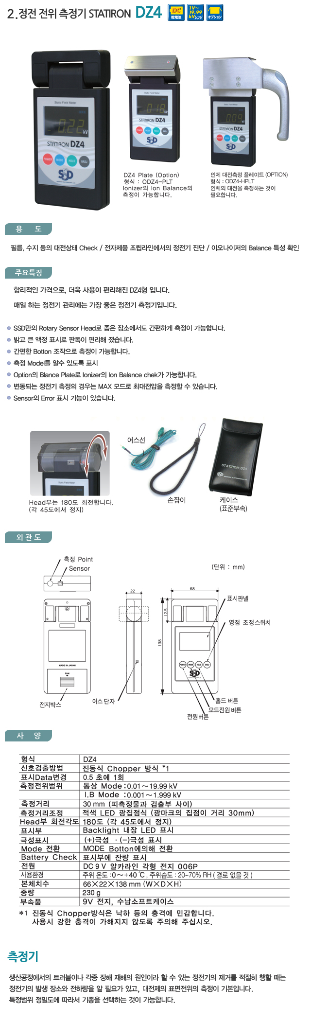 정전기 측정기 FMX-004 제품은 손바닥만한 사이즈의 컴팩트한 설계로 최대 ±30Kv(연속측정 및 데이터 로그가능)까지 가능합니다. 측정모드 측정거리 규 격 중 량 전 원 Auto,Hi,Low,Ionbalance 25mm ± 0.5mm 73(W)x115(L)x25(H)mm(본체) Plate포함 170g 건전지(006P) 1개